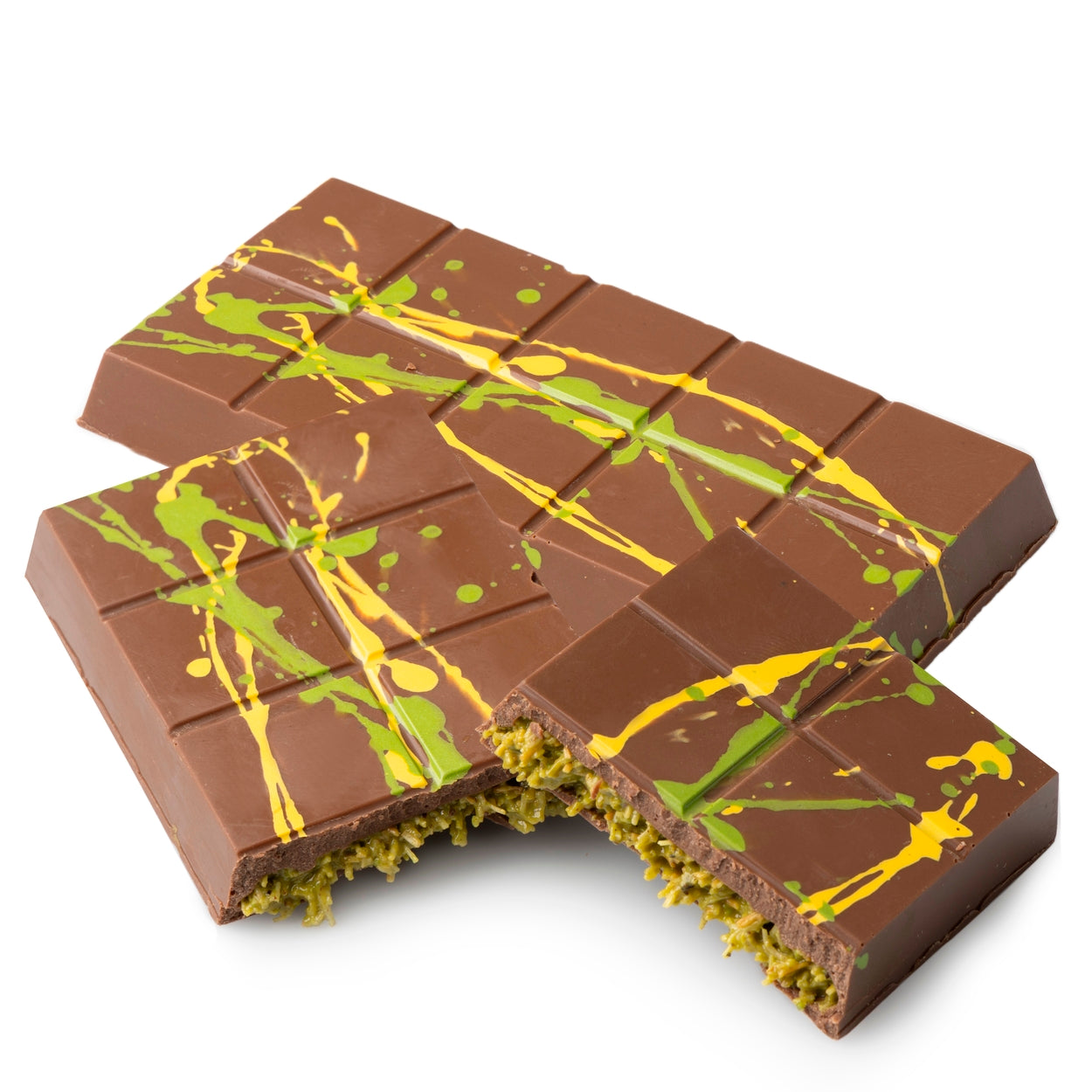 Introducing the Dubai Chocolate Bar — a luxurious confection that blends rich tradition with modern indulgence. This large, high-quality chocolate rectangle is filled with a delightful combination of toasted kataifi and pistachio cream. Kataifi, a classic Middle Eastern and Mediterranean ingredient made from delicate, thin strands of shredded phyllo dough, brings a light, crispy texture that perfectly complements the smooth, creamy pistachio filling. Wrapped in a shell of premium chocolate, each bite offers a symphony of textures and flavors, making it a truly unforgettable treat for those with a taste for elegance.
